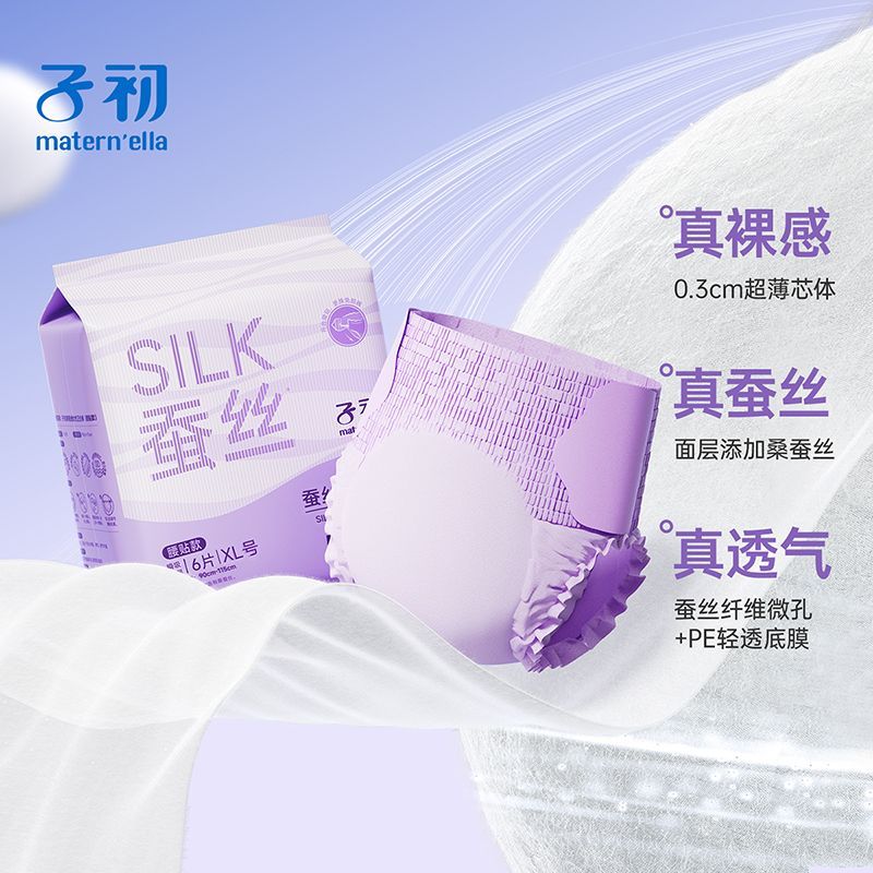 蚕丝表层,温柔呵护敏感肌。腰贴设计,紧密贴合防侧漏,经期安睡无忧。